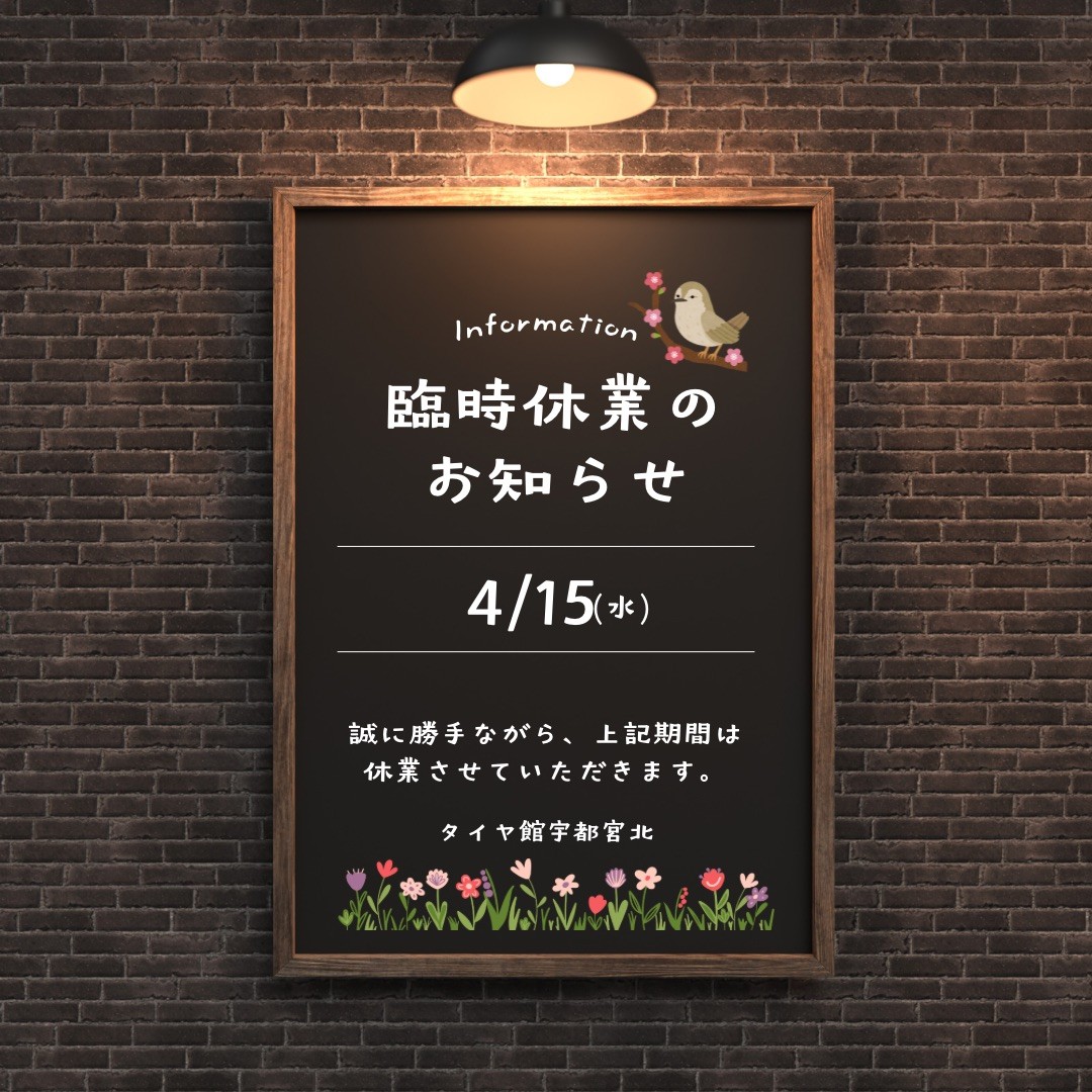 【お知らせ】4月15日(水)臨時休業となります ポスト 2026年4月13日 こんにちは。 タイヤ館宇都宮北店です。 誠に勝手ながら 4月15日(水)は臨時休業とさせていただきます。 ご来店を予定されていたお客様には ご不便をおかけいたしますが、 何卒ご理解の程よろしくお願い致します。 なお、翌日の15日からは通常営業となります。 タイヤ交換や点検など お気軽にご来店ください。 皆様のご来店を スタッフ一同お待ちしております。