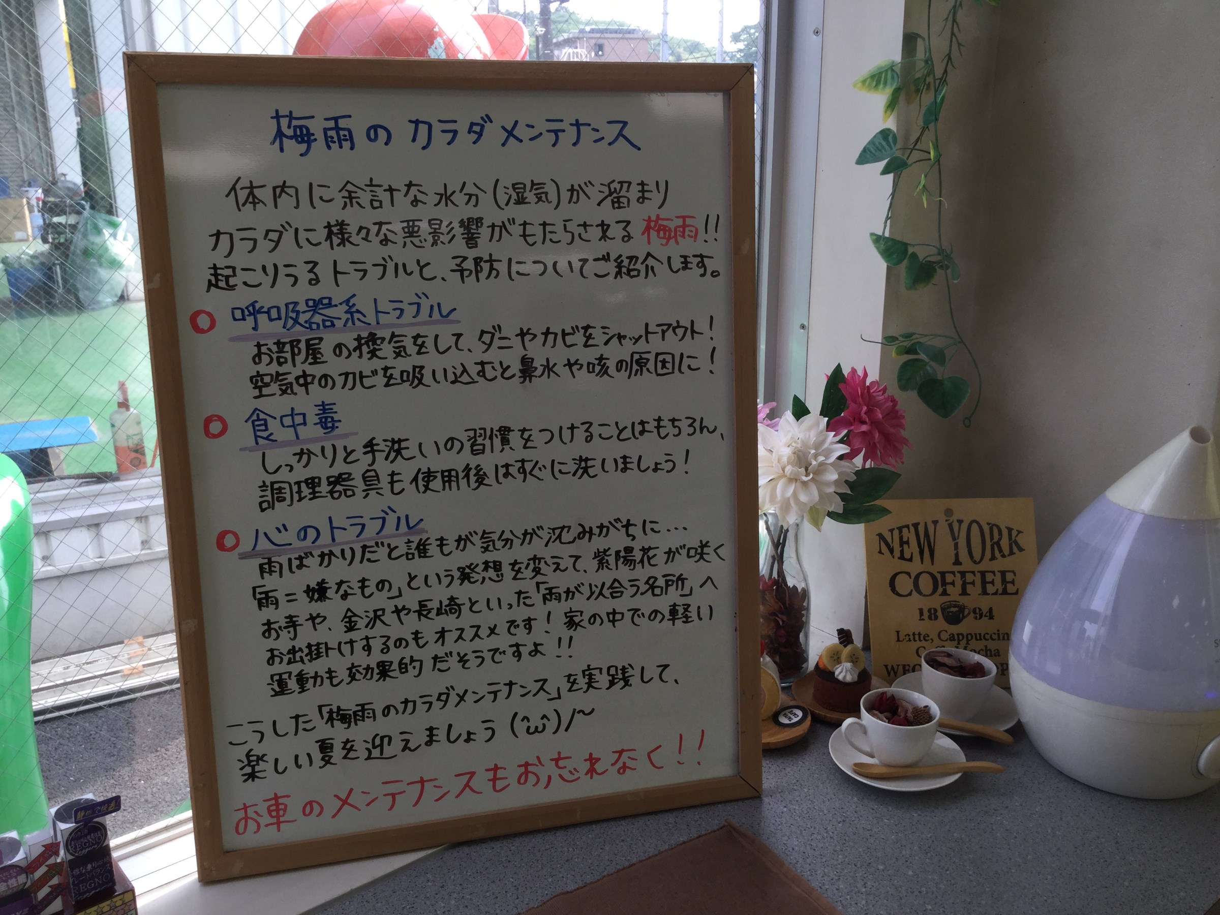 今月のコラム ポスト 2017年5月13日 みなさまこんにちは! 日中は動いていると暑いぐらいだいぶ暖かい日が増えてきましたね(゜_゜) と思っているとあっという間に梅雨が来ます! ということで今回はこんなコラムを書いてみました! 梅雨時期は心や体に不調が出やすい時期ですよね? そんな時だからこそ体をゆっくりとメンテナンスしてあげましょう♫ もちろん車のメンテナンスもお忘れなく!! ちょっとした習慣を見直して楽しい夏を迎えたいですね(●^o^●) 担当:みやもん