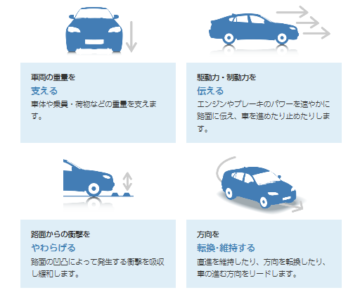 そして、ドライバーの安全・安心を守るためタイヤには主に4つの役割があります!