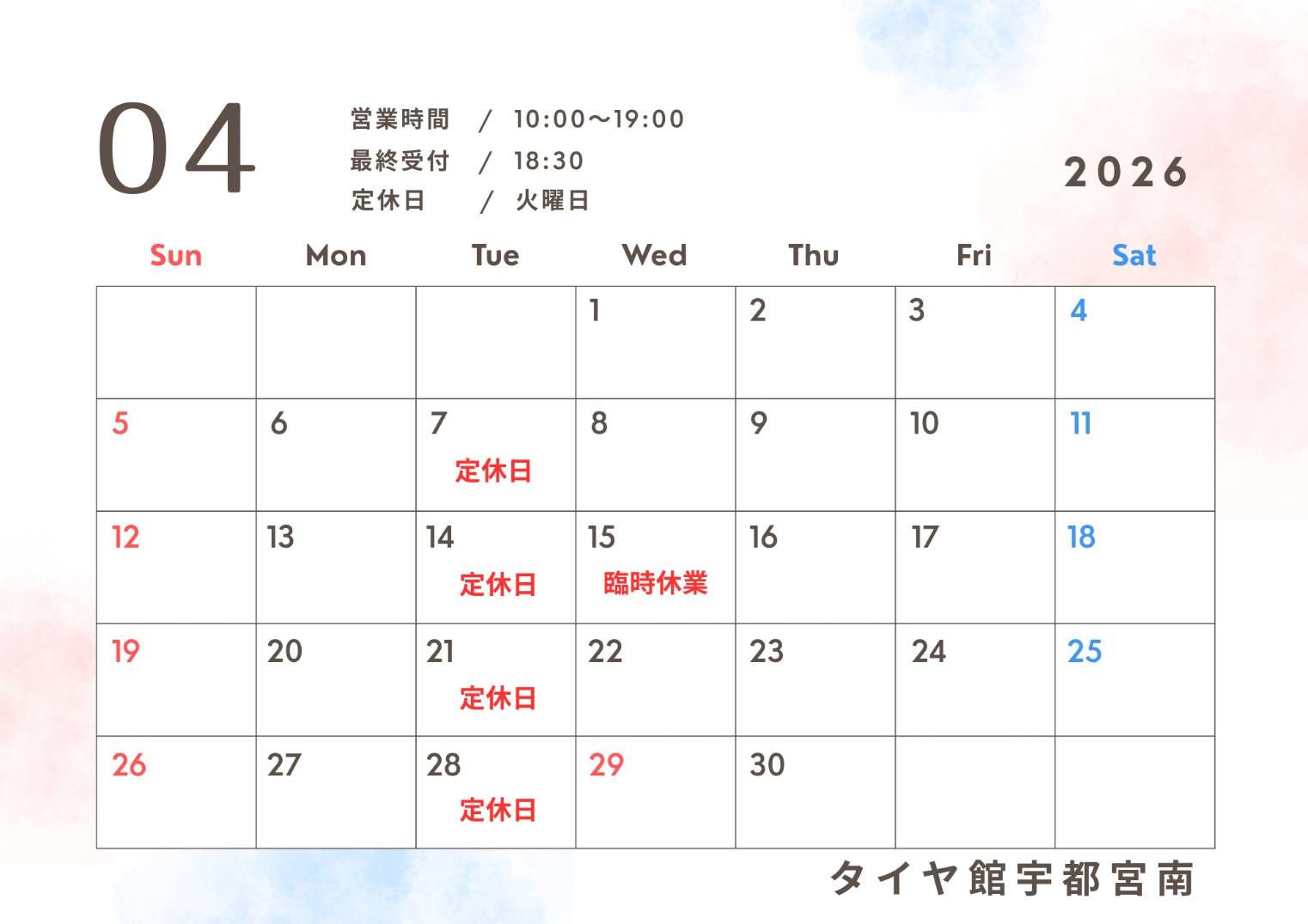 4月営業日・臨時休業日のお知らせ
