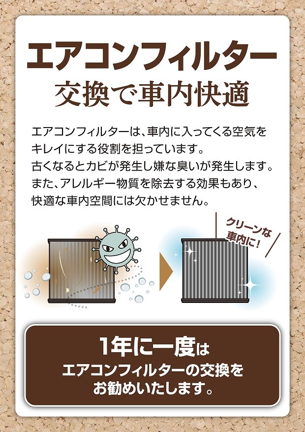 エアコンフィルターは1万キロに一度、もしくは1年に一回の交換をおすすめいたします。