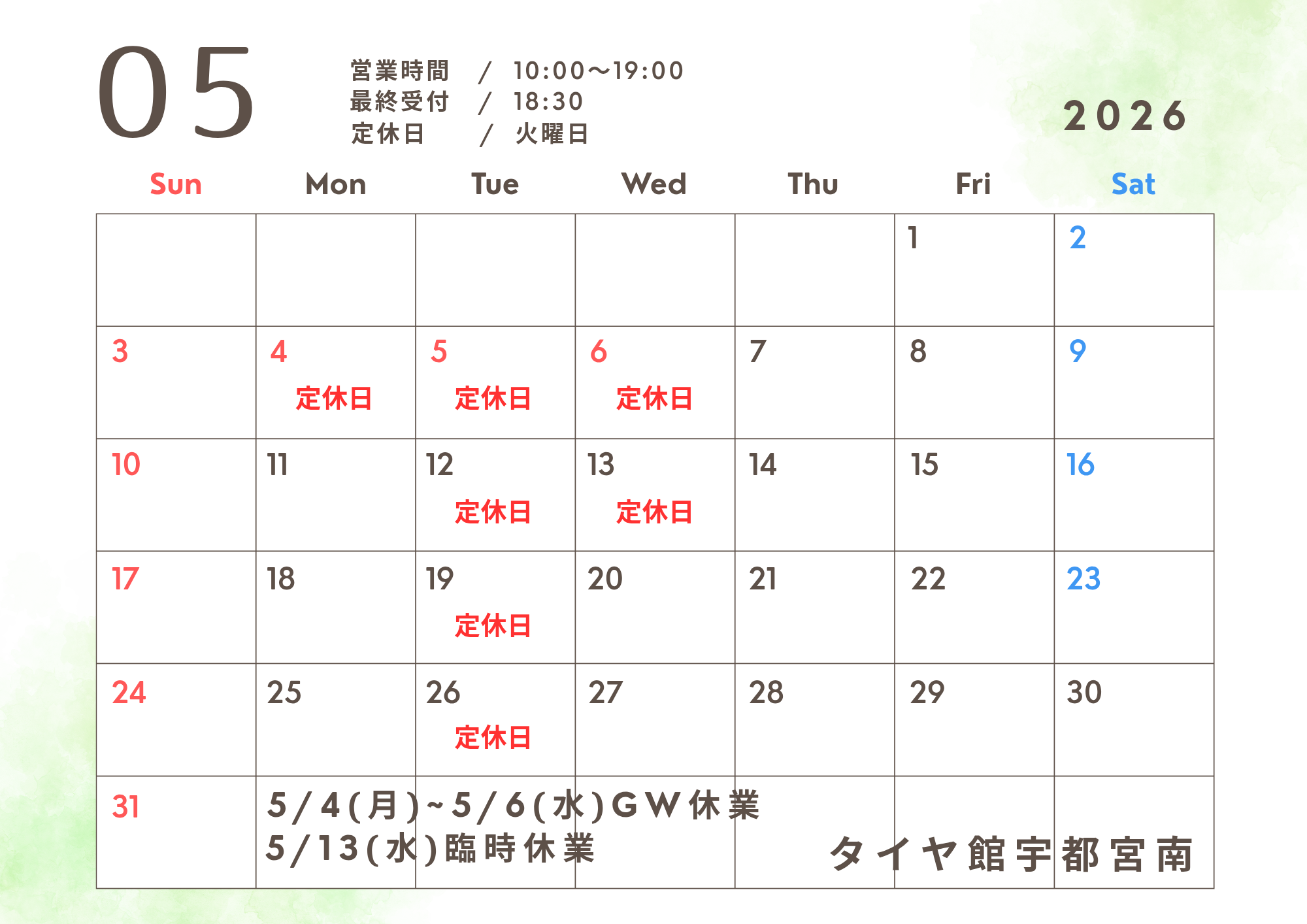 5月営業日・臨時休業のお知らせ ポスト 2026年4月30日 いつもタイヤ館宇都宮南をご利用いただき誠にありがとうございます。 5月の営業日および臨時休業日のご案内です。 毎週火曜日 定休日 営業時間 10:00~19:00(最終受付18:30) GW休業 5月4日(月)~ 6日(水) 臨時休業 5月13日(水) 5月7日(木)10:00より 通常営業いたします。 休業中はご不便ご迷惑おかけいたしますが ご理解のほどよろしくお願いいたします。 担当:☆彡