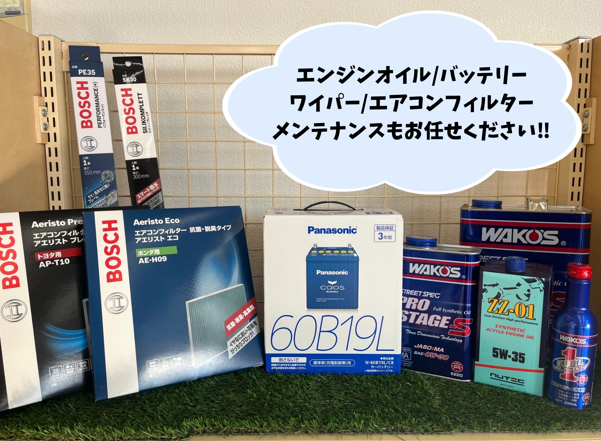 お車の快適な走行と長持ちをサポートするために欠かせないエンジンオイル・バッテリー・ワイパー・ATFオイル(オートマオイル)・エアコンフィルターなどを取り揃えております。気になる商品がございましたら、お気軽にお問い合わせください。