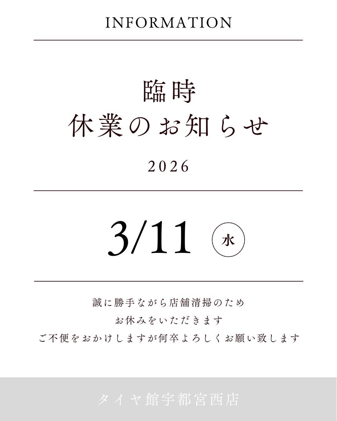 臨時休業のお知らせ ポスト 2026年3月9日 みなさんこんにちは(^^♪ タイヤ館宇都宮西店をご利用いただきありがとうございます。 3/10(火) 定休日 3/11(水)臨時休業 とさせて頂きます。 また3/12日(木)からは通常営業となります 皆様にはご不便お掛け致しますが何卒宜しくお願い致します。