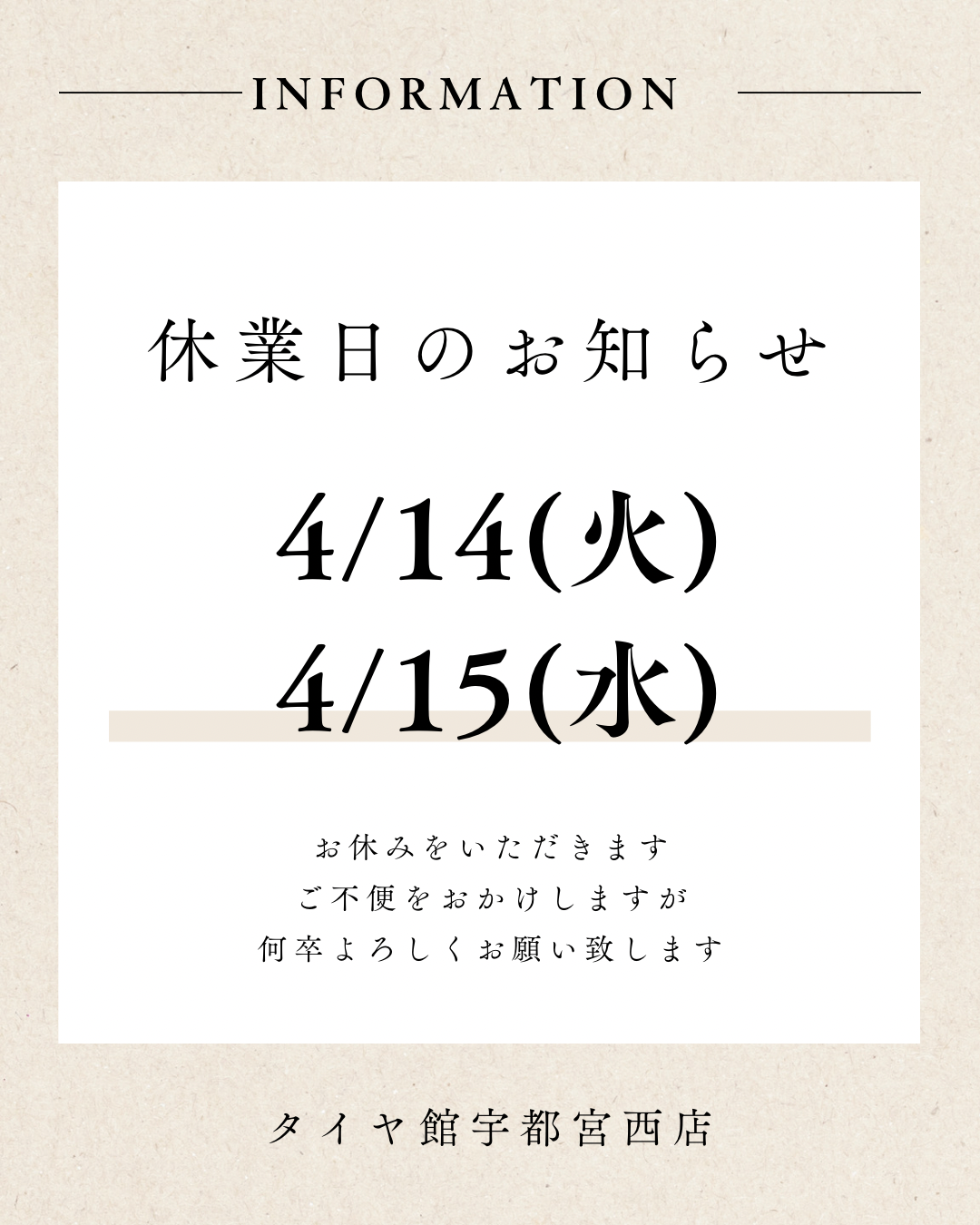 定休日・臨時休業のお知らせ ポスト 2026年4月13日 皆さんこんにちは(^^♪ タイヤ館宇都宮西店です!! 明日・明後日は定休日・臨時休業となっております。 皆様にはご不便おかけしますが何卒宜しくお願い致します。 16日木曜日から通常営業となっておりますので 皆様のご来店心よりお待ちしております☆彡 カテゴリ:お知らせ 担当:CHI