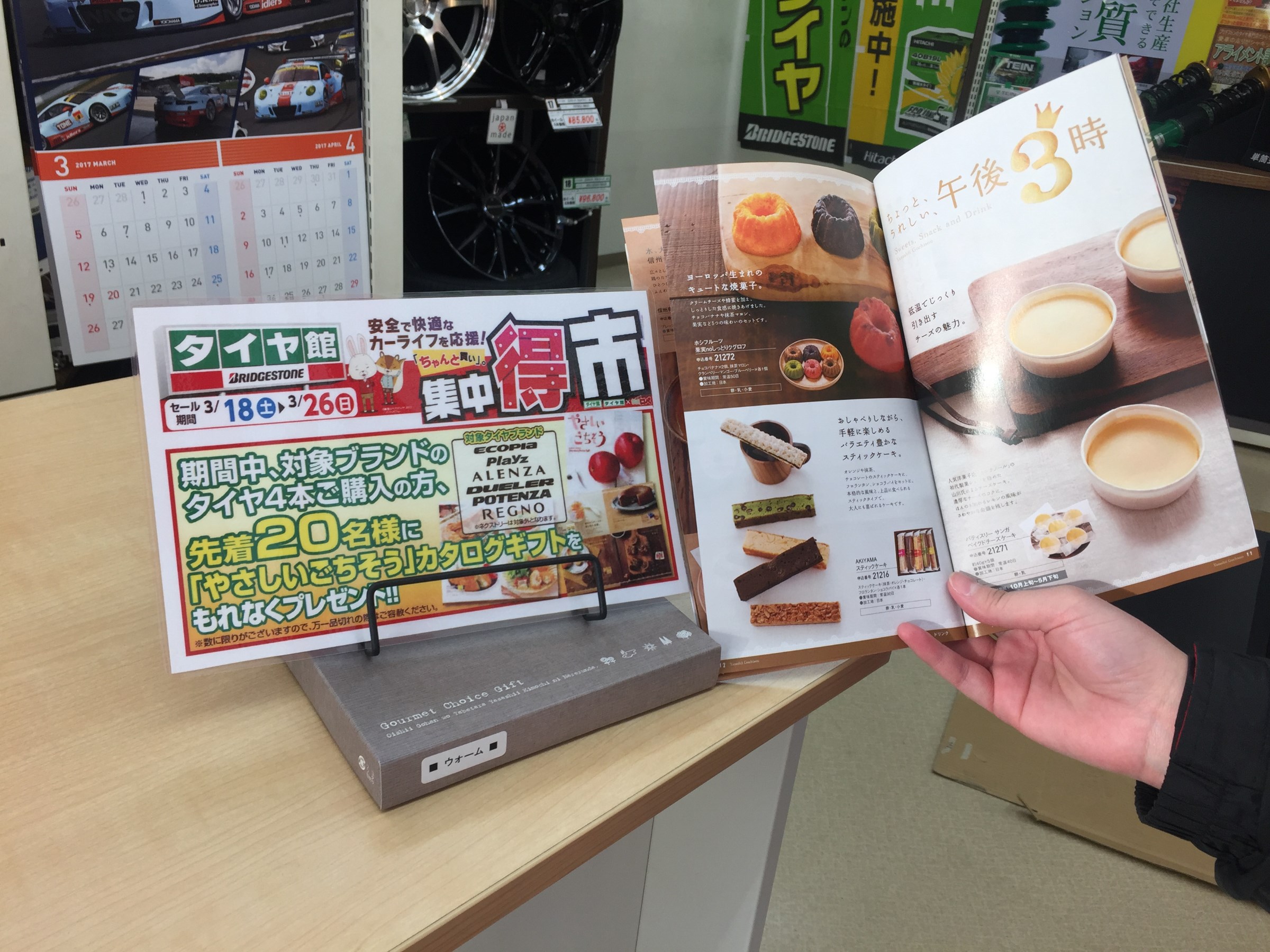 しかも、期間中に対象ブランドのタイヤ4本ご購入された方、先着20名様に「やさしいごちそう」カタログギフトをプレゼントさせていただきますので、ご来店お待ちしております。