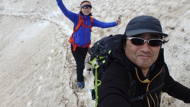 峰の茶屋跡避難小屋で休憩後 剣ヶ峰の雪渓に挑む
