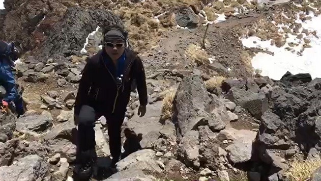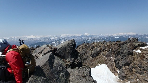 山頂直下の雪渓も登り切り、山頂を構成する溶岩ドームにたどり着く