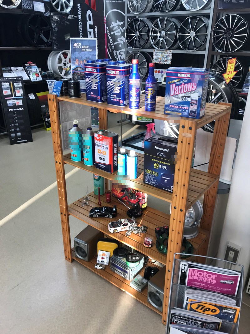 ガレージ横の棚にはオイルや添加剤、バッテリー等を展示販売しています。