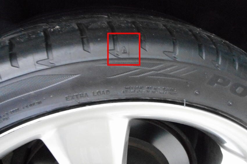 どこにあるかというと、タイヤショルダー部に△のマークが目印です。