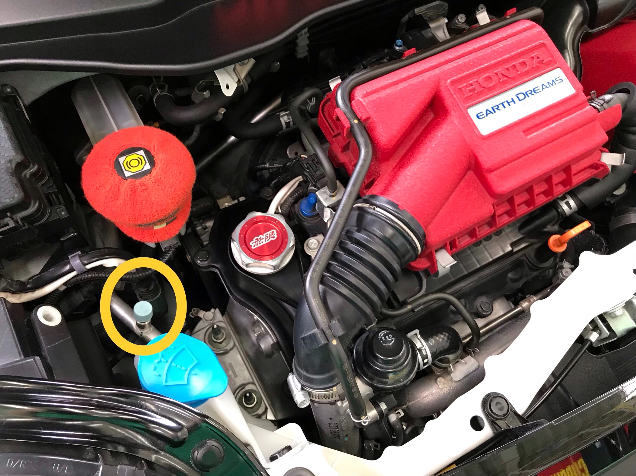 早速施工していきましょう。まずエンジンルーム内エアコンシステムの配管から低圧弁を探します。