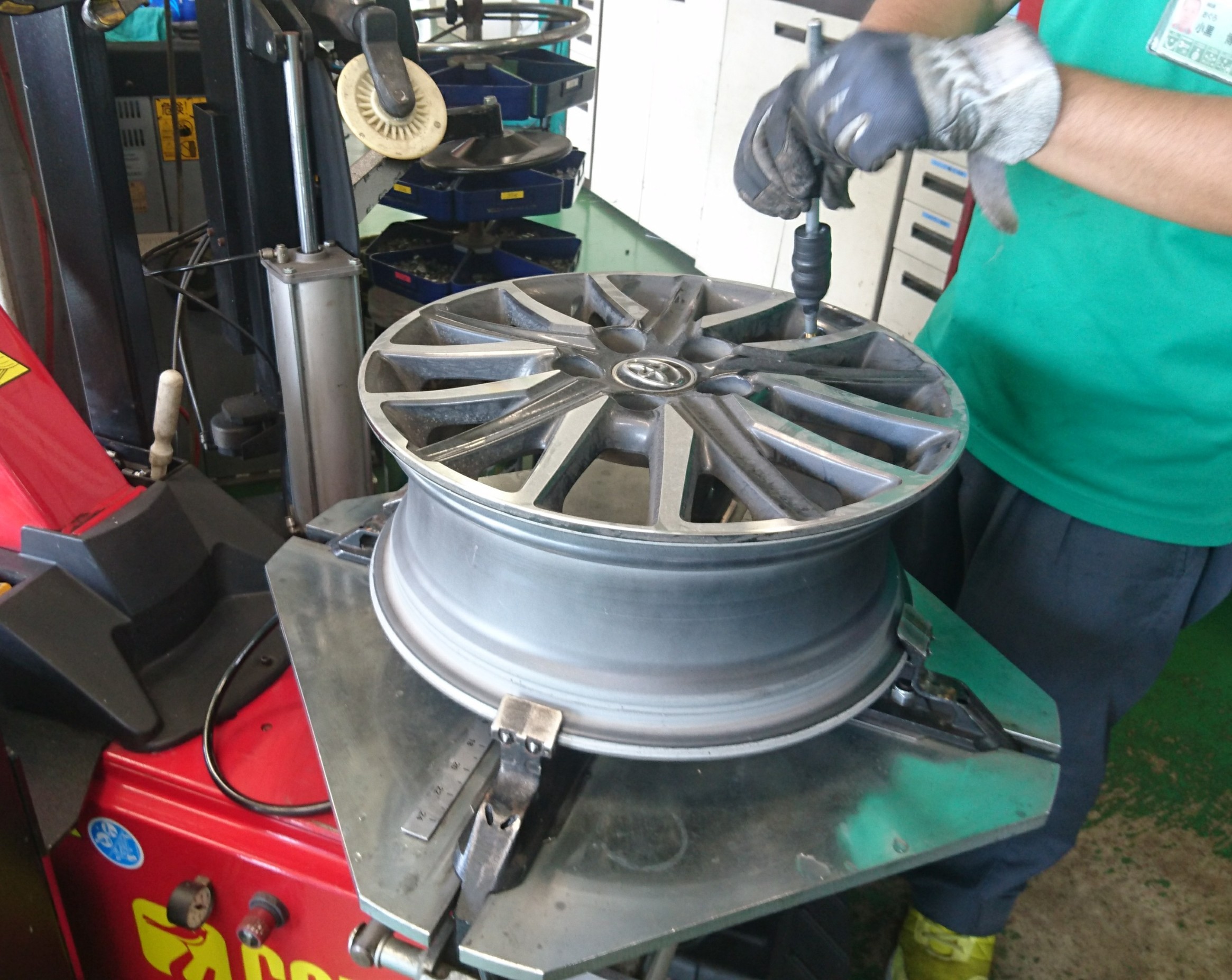新しいタイヤをホイールに組み込んでエアーを入れていきます