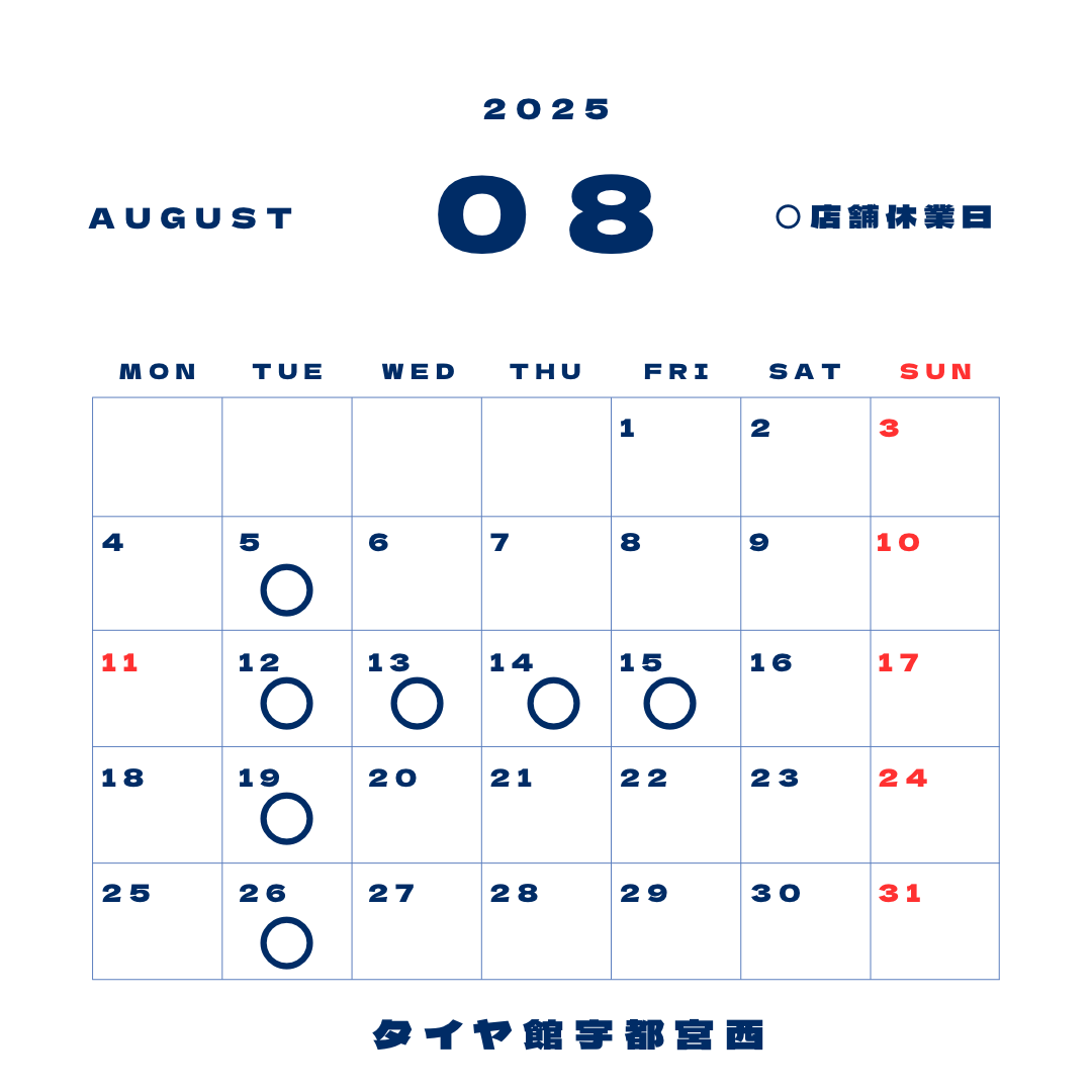 みなさんこんにちは!! いつもタイヤ館宇都宮西店をご利用頂き誠に ありがとうございます(^^)/ 7月も残りわずかですね・・・ 8月の定休日・臨時休業のお知らせをさせていただきます!! 毎週火曜日が定休日となっておりまして 12日~15日は夏季休業とさせていただきます。 皆様にご迷惑をお...