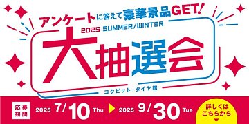 いつも当店をご利用いただきまして、ありがとうございます。 7月10日(木)から、「夏/冬の大抽選会」を開催しております! コクピット・タイヤ館アプリからアンケートに答えて頂くと、抽選で豪華景品をプレゼント! コクピット・タイヤ館アプリからアンケートをお答え頂いた方全員、抽選にご参加いた...