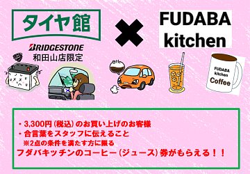 いつもタイヤ館和田山店のホームページを ご覧いただきありがとうございます。 企画開催のお知らせです! タイヤ館和田山店がフダバキッチンさんとコラボさせていただきました!! コラボ内容は。。。 あることをするとフダバキッチンさんのコーヒー(ジュース)券がもらえる 企画となっております。 ...