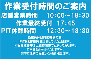 いつも当店をご利用いただきまして、誠にありがとうございます。 2026年1月5日より、作業受付時間を変更しました。 【店舗営業時間】10:00~18:30 【作業最終受付時間】17:45 【PIT休憩時間】12:30~13:30 従業員休憩時間確保の為、PIT休憩時間を設けさせていただきます。 ※お見積等は上記時間帯でも...