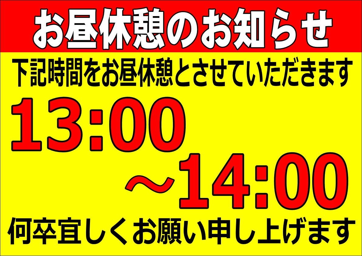 お昼休憩取得のお知らせ 2025年6月1日 タイヤ館矢賀店のホームページをご覧いただき、誠にありがとうございます。 当店ではお昼13:00~14:00をお昼休みとさせていただきます。 ご来店いただきますお客様には何かとご不便おかけしますが、 何卒ご理解の程お願い申し上げます。