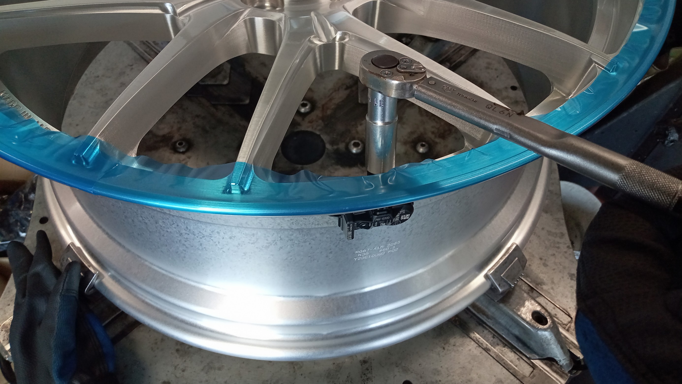 純正ホイールに装着されたTPMS空気圧センサーを外し、