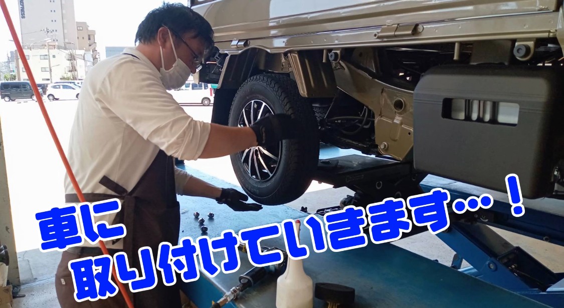 タイヤをホイールに組み替えたら、専用の工具を使って車に取り付けていきます!