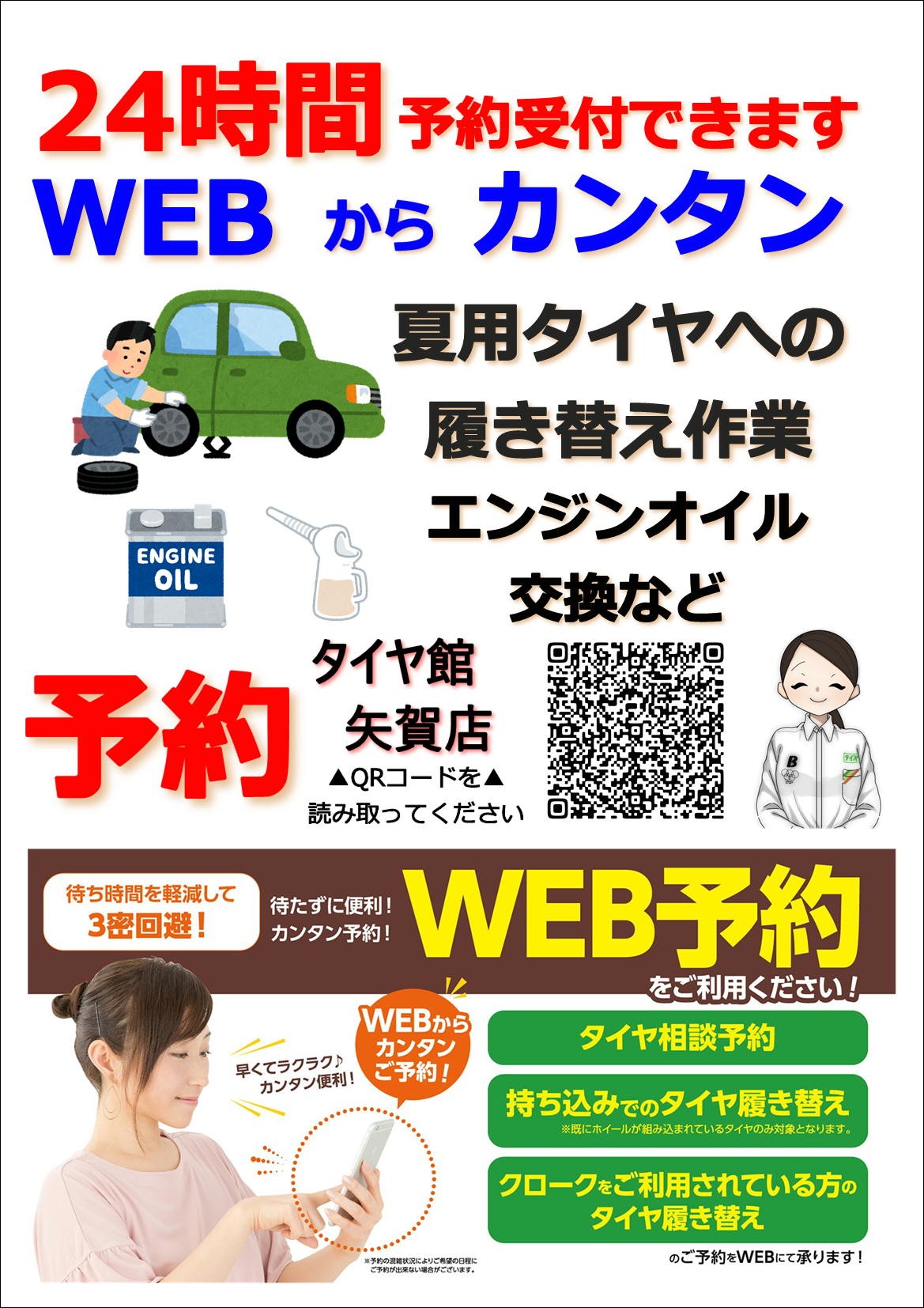 タイヤの履き替えとエンジンオイル交換も★同時にWEB予約が可能です。