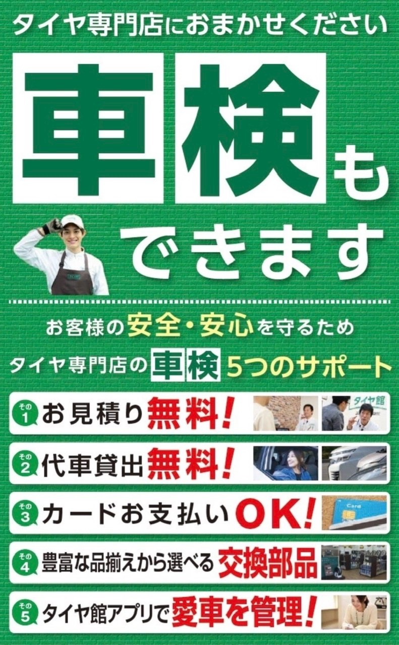 車検も是非、タイヤ館へお任せください★ ポスト 2025年3月9日 こんにちは! タイヤ館矢賀店です(^^)/ 車検も取扱っております♪ 先ずはご相談 お待ちしております(^^)/ タイヤ館 矢賀 住所:732-0042広島県広島市東区矢賀5-1-1 電話番号: 082-510-0010 タイヤ点検・安全点検/タイヤ履き替え/オイル交換/その他ピット作業の予約