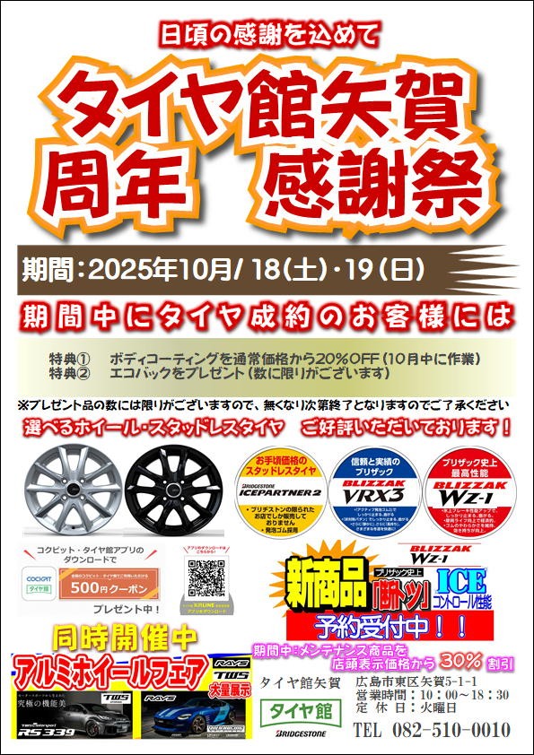 来週18&19日はタイヤ館 矢賀店 周年祭!!!
