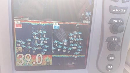 午前中は最新の魚群探知機に魚たちは反応があるもののなかなか釣れず(;一_一)