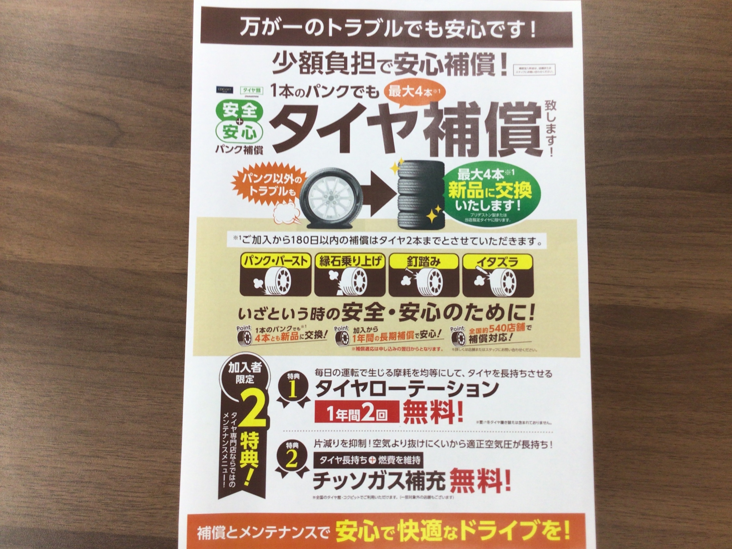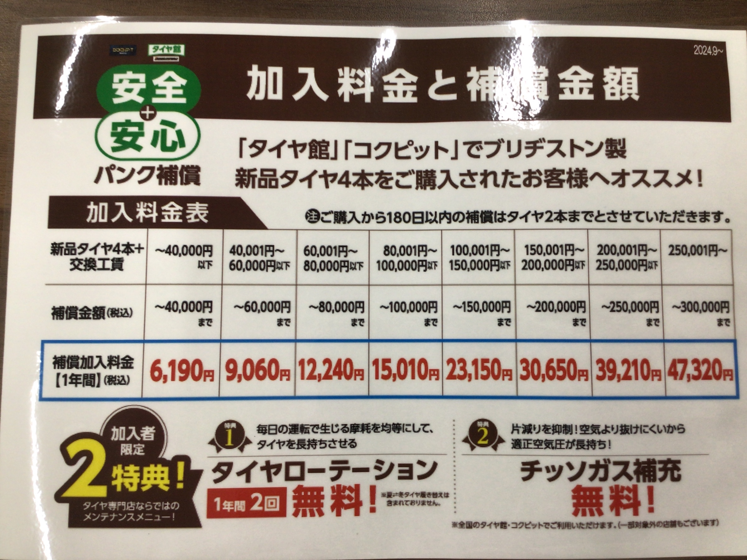 パンク補償 入会料金のお知らせ 2024年8月29日 パンク補償の入会料金ですが、 2024年9月1日より価格改定いたします。 【パンク・バースト】【サイドカット】【クギ踏み】【イタズラ】 などに対応します!! 補償期間は【1年間】です。 なお新品タイヤ4本購入時のみ入会できます。 ご自身のスマートフォンをご準備の上、決済方法としてはクレジット決済のみとなりますので、ご注意ください。 詳しくは当店スタッフにお尋ねください。