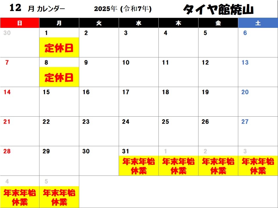 2025年12月 お休みのお知らせ 2025年11月30日 2025年12月の店舗お休みのおしらせです 年始は1月6日(火)からの営業となります。 タイヤクロークご利用のお客様の最終配送期限は12月19日となりますのでご注意ください。