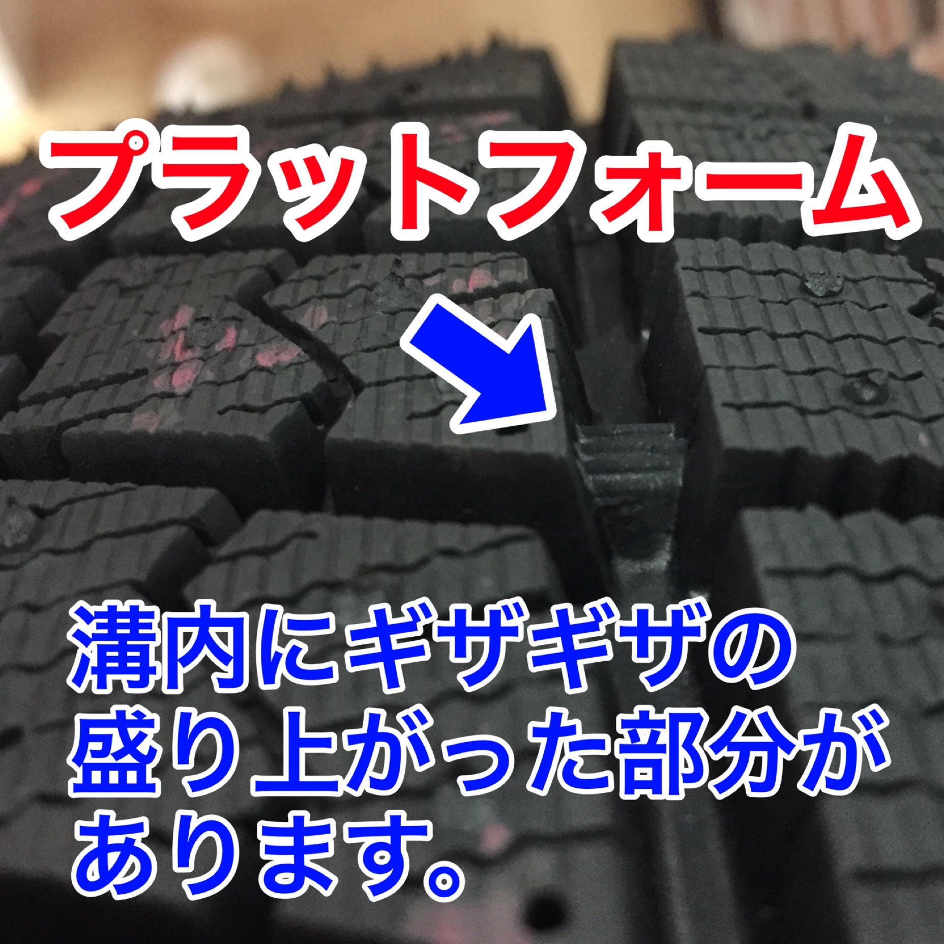 このタイヤは新品のため、溝の深くにギザギザがありますが、使用して接地面の溝が減っていくとこのギザギザと接地面との段差がなくなりつながってしまいます。