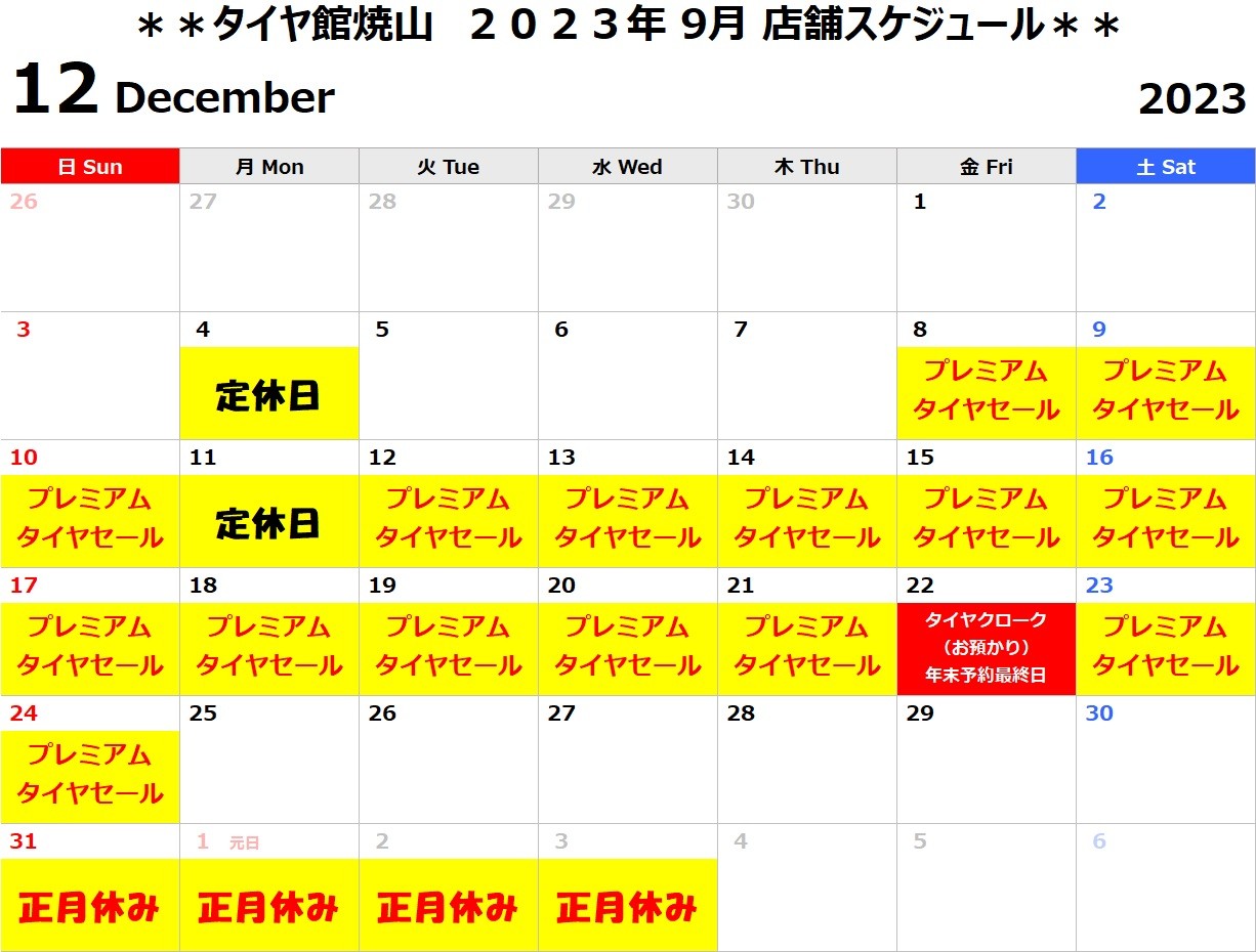 2023年12月 タイヤ館焼山 店舗休日案内