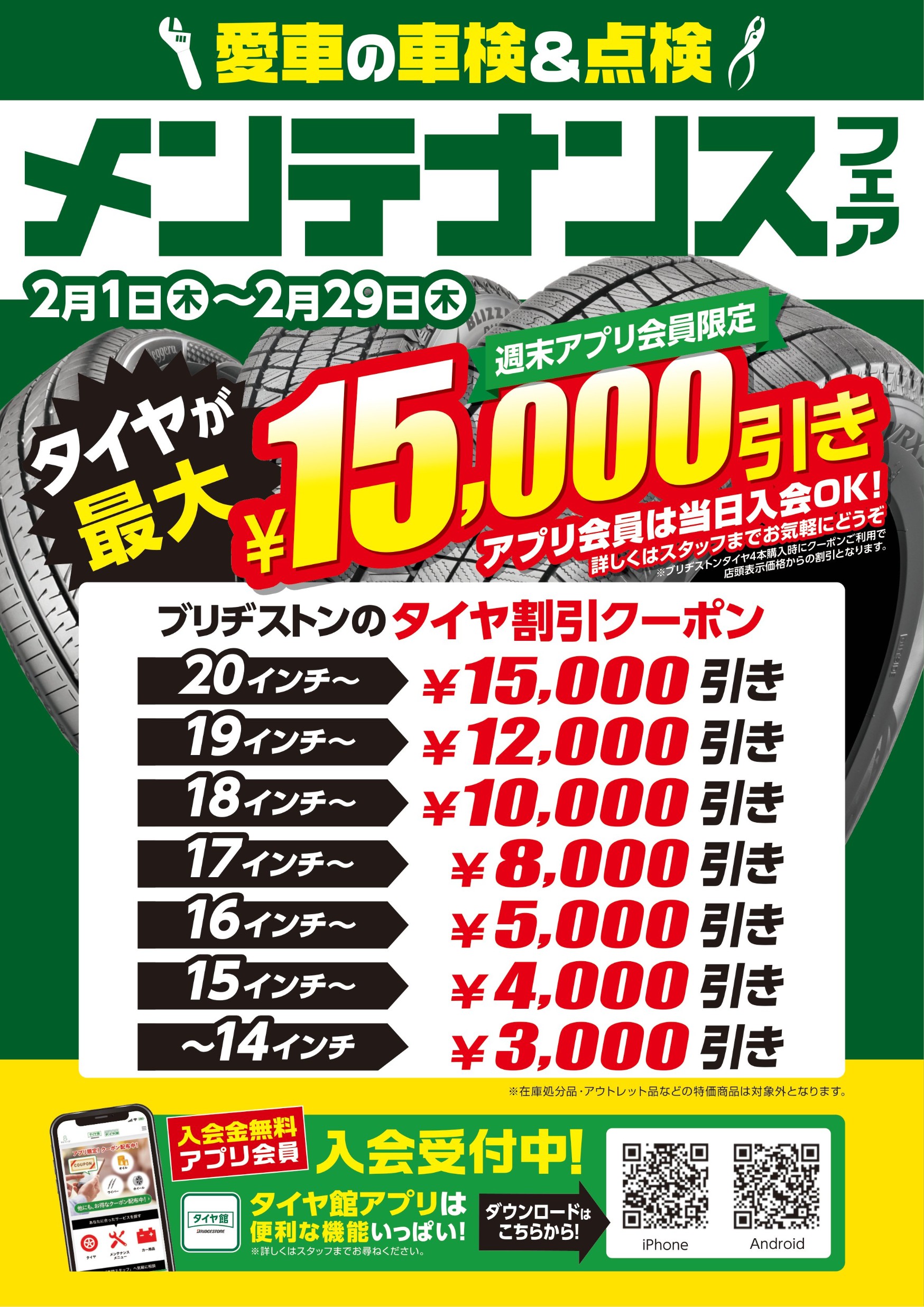 愛車「メンテナンスフェア」 ポスト 2024年2月2日 愛車メンテナンスフェア開催 みなさま 今年の1月も終わってしまいました。 昨年の末や正月に頑張った愛車を労わってあげませんか?? タイヤ館ではこの2月の1か月間 メンテナンスフェアを開催いたします。 タイヤだけでなくオイル交換やワイパー・バッテリー交換までお得に買えちゃう1か月!! ぜひこの機会にご利用ください!! 関連情報もあわせてご覧ください WEBチラシ「メンテナンスフェア」 カテゴリ:お知らせ