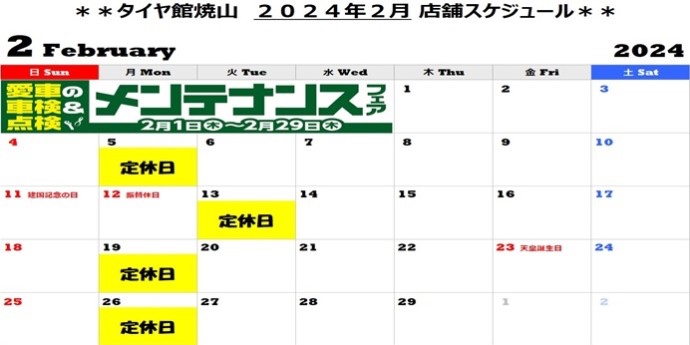 ◇2月営業のお知らせ◇ ポスト 2024年2月1日 いつもホームページをご覧いただきありがとうございます。 2月営業日のお知らせです。 2月12日月曜日は祝日のため営業いたしまして、翌日2月13日火曜日に振替休日となりますので、よろしくお願いします。 カテゴリ:お知らせ