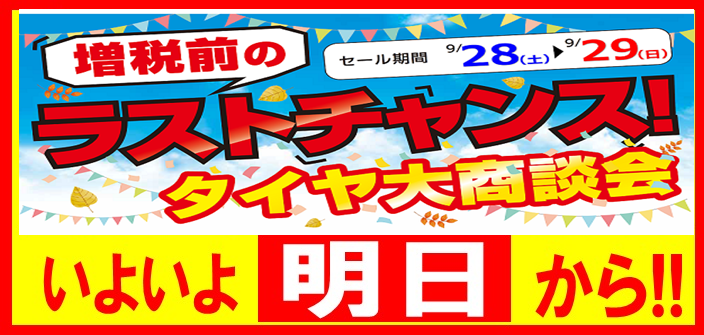 増税前最後のセール行います。 ポスト 2019年9月27日 こんにちは!!愛知県 名古屋市天白区 名古屋高速 高針出口からすぐ近くのタイヤ館 焼山です! 明日・明後日(9月28日・29日)限定の増税前最後のセールを行います。増税前のラストチャンスになります。スタッドレスタイヤの購入を考えているお客様・ノーマルタイヤの交換を考えているお客様ぜひ一度当店にご来店ください。 担当:スタッフ一同