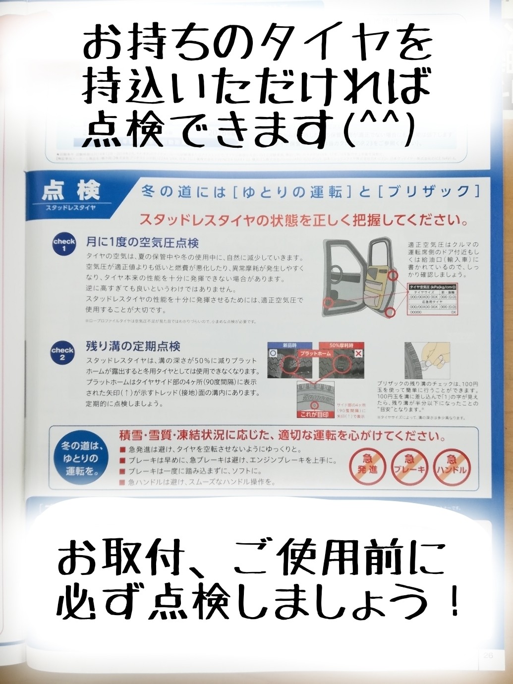 しっかりタイヤのプロが点検しますので、
