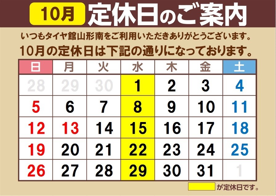 10月の定休日は1.8.15.22.29となります。皆様のご来店お待ちしております。