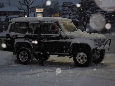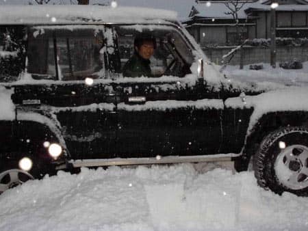 と、ここまではよかったのですが意外に雪が多くフェンス側に停めてある布施スタッフ