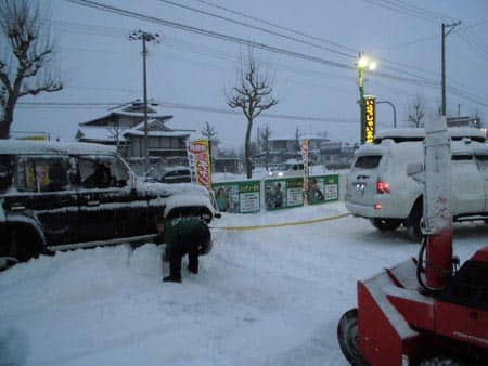 写真2・・・馬場チーフが牽引・店長が雪掘り・布施スタッフ「店長がんばれーw」