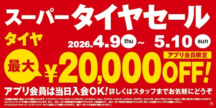 タイヤ館山形南 スーパータイヤセール実施中! ポスト 2026年4月11日 WEBをご覧いただきありがとうございます。 当店ではただいま、タイヤ館アプリご登録でお得なタイヤ購入クーポンを獲得いただける セールを実施中です。 タイヤのインチが大きくなればなるほど値引きが大きくなりますので是非ご利用ください。 タイヤ館 山形南 住所:990-2323山形県山形市桜田東1丁目10-28 電話番号: 023-626-7117 相談予約 担当:矢作