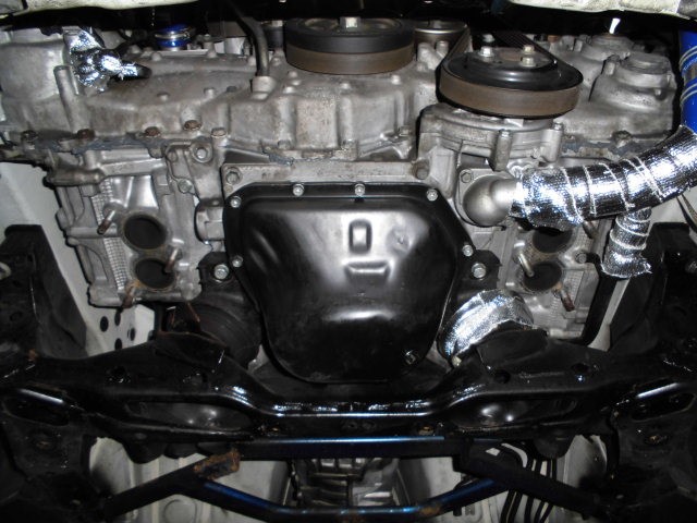 黒い部分がオイルパンなんですが、純正のエキマニを逃がすのにこういう形状になったようです。