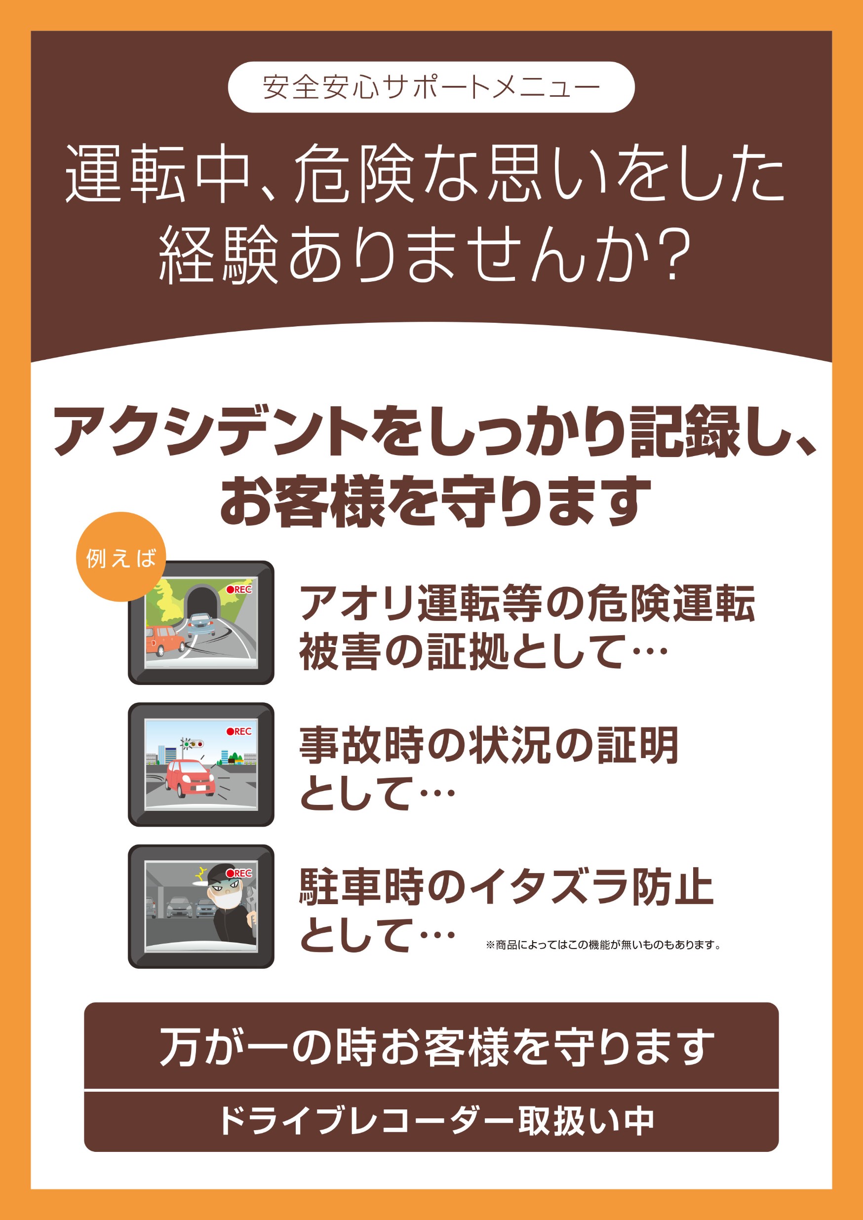 ドライブレコーダー☆取り扱いあります!! ポスト 2019年10月1日 話題になっている“ドライブレコーダー”。 『気になっているけれど種類がたくさんあって、どれを選んだら良いのか分からない...』 というお客様、ドライブレコーダーも当店にお任せください!! 自己防衛アイテムとして、また趣味・思い出の記録としても活躍間違い無し!! 行楽が多くなるこの機会にご検討ください☆ ★取付時間30分~/取付作業料は車種により異なります。 ★在庫切れの際は取り寄せとなります。(詳しくはお問合せください) カテゴリ:お知らせ