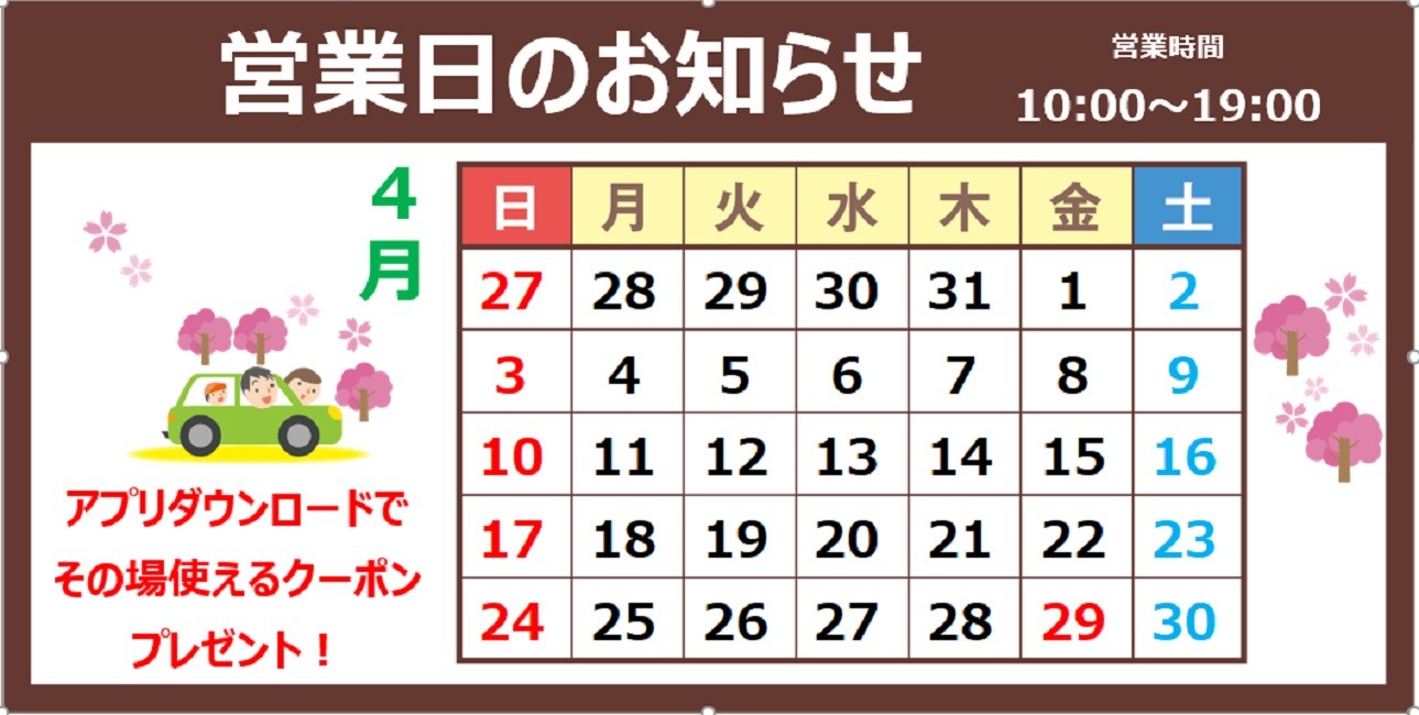 いつもタイヤ館山形南WEBをご覧頂き誠にありがとうございます!! 4月の定休日・営業時間のお知らせです。 開店10時00分~19時00分閉店となりますのでご来店時は ご確認お願い致します。 さらに、定休日なしで営業致します! タイヤ交換等で混み合うことが予想されますので お時間には余裕を持って...