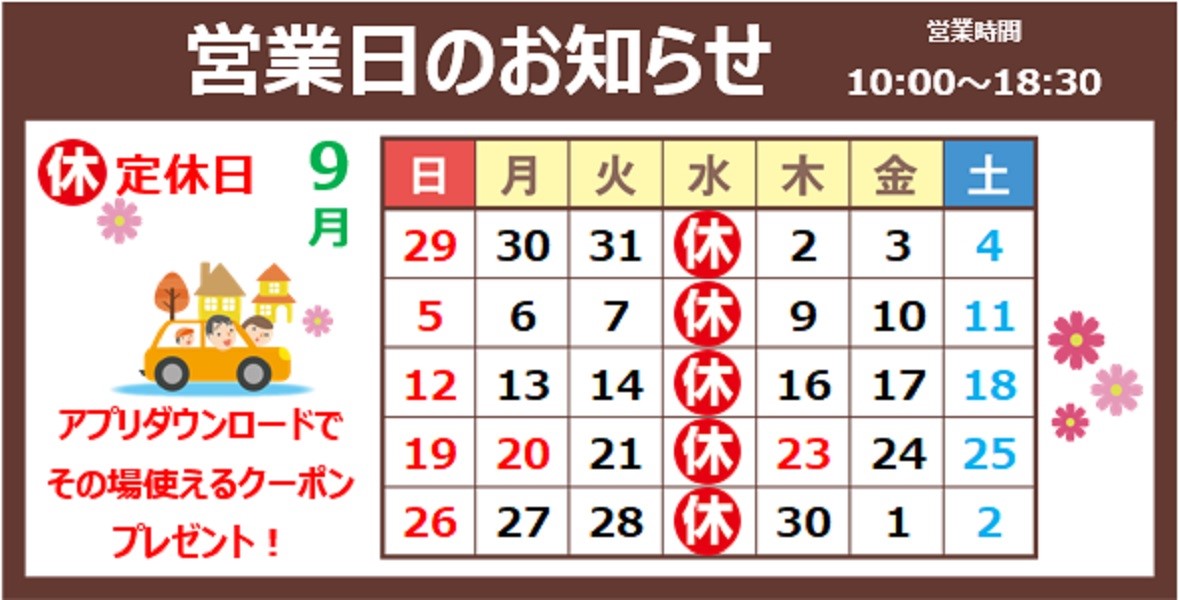9月定休日のお知らせ。