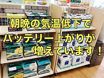タイヤ館山形南のWebをご覧頂きありがとうございます。 毎年この時期になると、バッテリー上がりのお問い合わせが増え、ご対応させて 頂いております。 今の時期でのバッテリー上がりの原因は【気温低下からのバッテリー上がり】になります。 バッテリーの性能は温度が25℃の時に 100%発揮すると言わ...