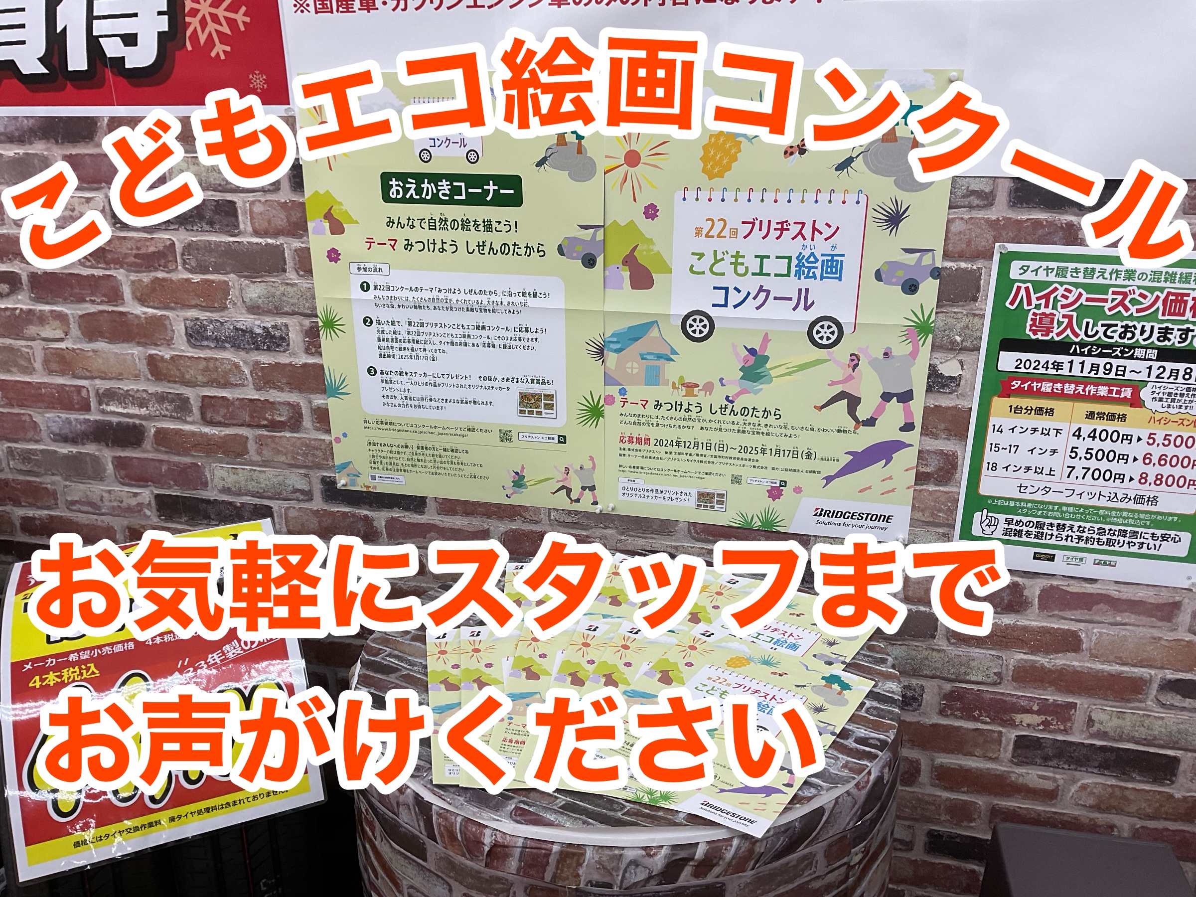 ブリヂストングループでは、子どもたちに環境・自然をテーマに絵を描いてもらい、 それを通じて、大人も含めた多くの人々に環境・自然の大切さを伝えていきたいと考え 2003年よりこのコンクールを開催しています。 当店舗ではご自宅で描き終わった後、店舗のスタッフにお渡しいただく事で 応募受付...