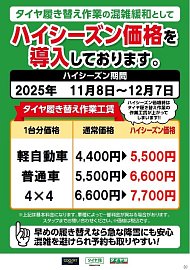いつもタイヤ館山形南をご利用いただきありがとうございます。 2025年11月8日~12月7日まで スタッドレスタイヤへの履き替え作業の混雑緩和として ハイシーズン価格を導入させていただきます。 皆様のご理解・ご協力お願いいたします。 履き替えのご予約はWEBから24時間受付しています。 皆様のご来...