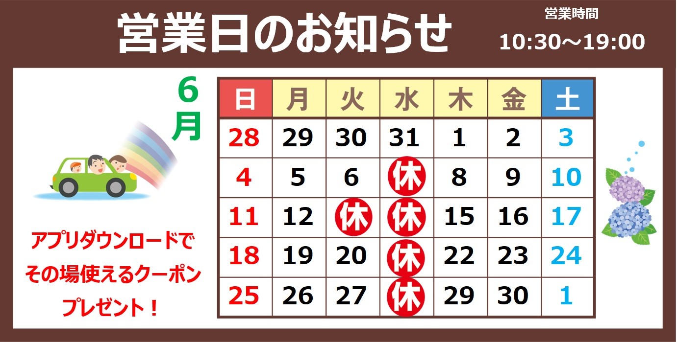 いつもタイヤ館山形南をご利用いただき誠にありがとうございます! 6月の定休日と、営業時間に関するご案内です♪ 10時30分開店~19時閉店となります。 定休日は毎週水曜日になりますが 6/13(火)は休業とさせて頂きます。 大変ご不便をお掛けしますが何卒ご理解賜りますよう お願い申し上げます。