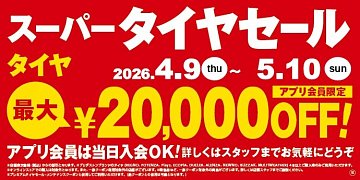 記事一覧 タイヤ館山形南 スーパータイヤセール実施中! WEBをご覧いただきありがとうございます。 当店ではただいま、タイヤ館アプリご登録でお得なタイヤ購入クーポンを獲得いただける セールを実施中です。 タイヤのインチが大きくなればなるほど値引きが大きくなりますので是非ご利用ください。 2026年4月11日 ポスト