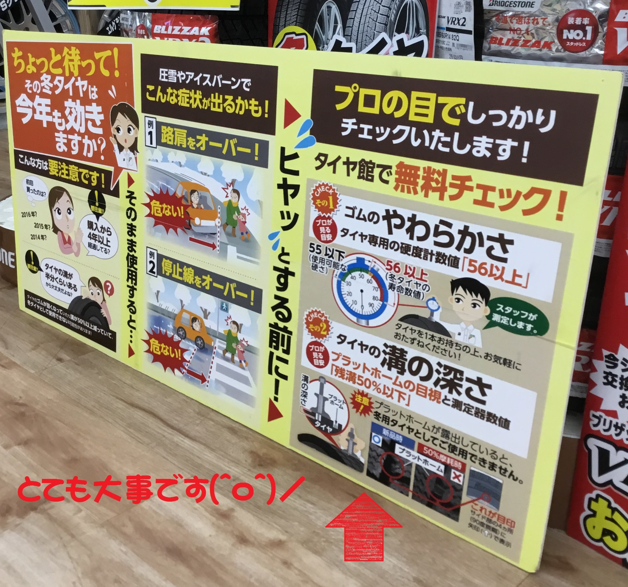 タイヤ専用の硬度計数値が、56以上の場合は冬タイヤの寿命数値です。