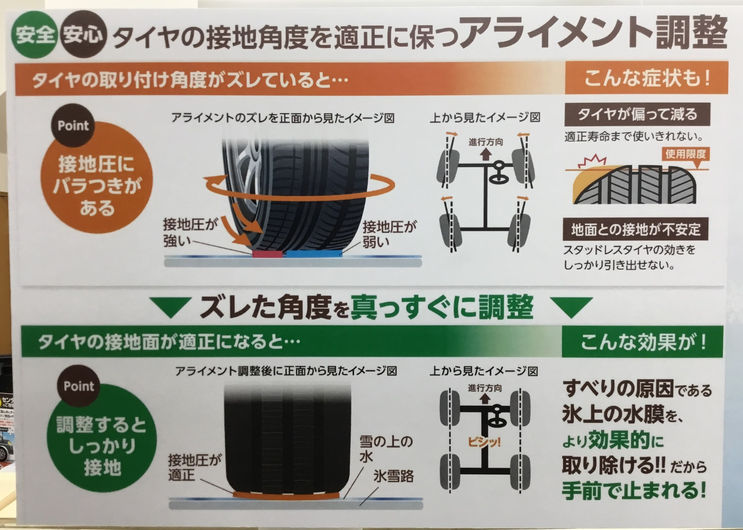 アライメント調整というのは、タイヤの接地角度を適正に保つために必要な作業です!